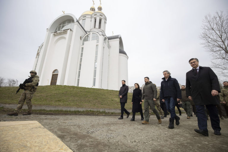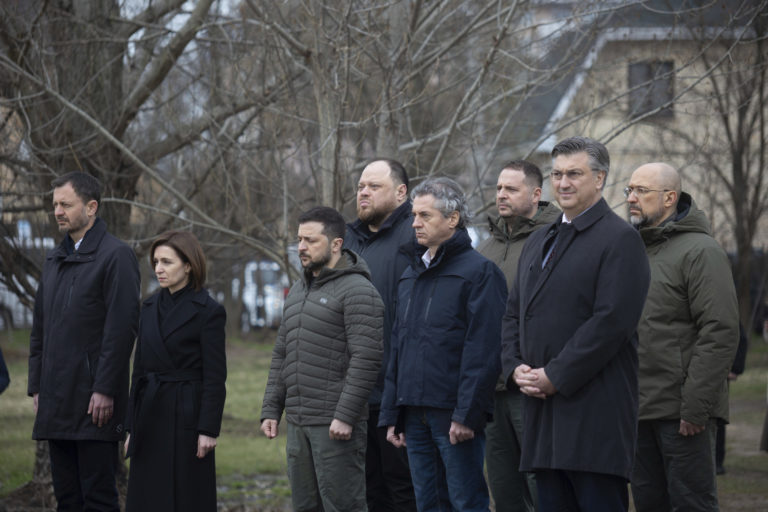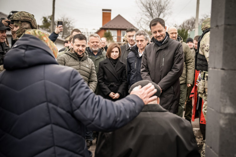 Na ceremónii v Buči sa okrem slovenského premiéra Eduardad Hegera a ukrajinského prezidenta Volodymyra Zelenského zúčastnili aj moldavská prezidentka Maia Sandu aj premiéri Chorvátska Andrej Plenkovič a Slovinska Robert Golub. Buča, 31. marec 2023. Foto: Ukrainian Presidential Press Office via AP.