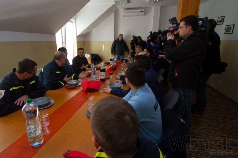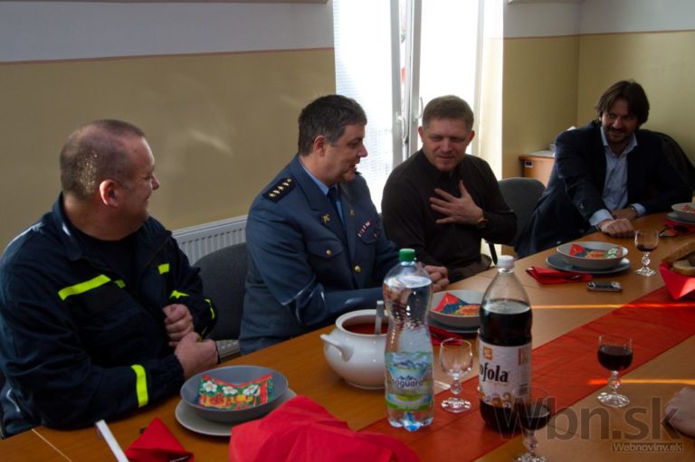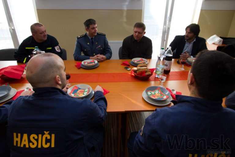 Premiér Robert Fico (tretí zľava) počas návštevy službukonajúcich hasičov, stanice Hasičského a záchranného útvaru v Šamoríne. Šamorín, 24. december 2014. Foto: SITA/Ľudovít Vaniher