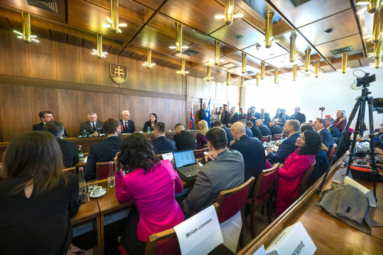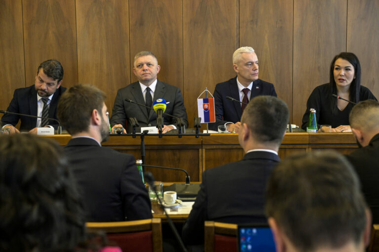 Uprostred zľava v pozadí: Podpredseda Výboru NR SR pre európske záležitosti Michal Stuška, predseda vlády SR Robert Fico, predseda Výboru NR SR pre európske záležitosti Ján Ferenčák a podpredsedníčka Výboru NR SR pre európske záležitosti Beáta Jurík počas zasadnutia Výboru NR SR pre európske záležitosti k stretnutiu premiéra SR Roberta Fica s prezidentom Ruskej federácie Vladimírom Putinom a k ďalším krokom SR, ktoré vyplývajú zo zastavenia tranzitu ruského plynu cez Ukrajinu. Bratislava, 10. január 2025. Foto: SITA/Milan Illík
