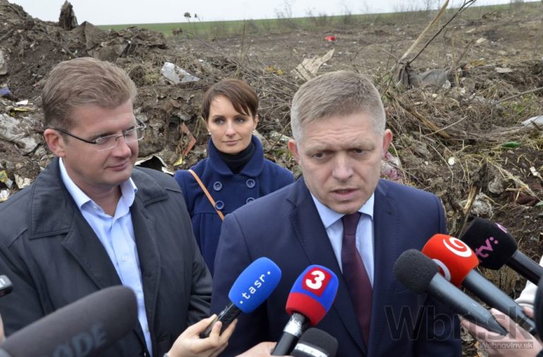 Predseda vlády SR Robert Fico (vpravo) a minister životného prostredia SR Peter Žiga (vľavo) počas tlačového brífingu pri príležitosti kontrolného dňa projektu Odstránenie nelegálnej skládky Letanovský mlyn. Spišské Tomašovce, 7. november 2015. Foto: SITA/Radoslav Maťaš