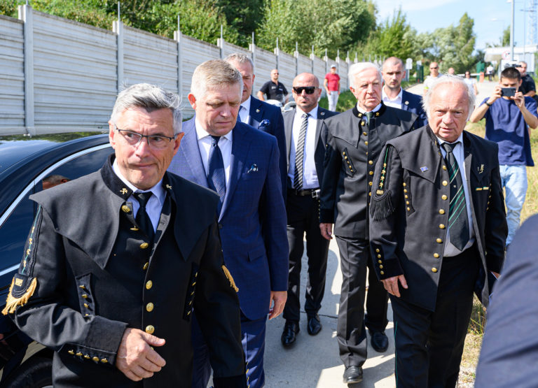 V popredí zľava: Predseda Dozornej rady Hornonitrianskych baní Prievidza (HBP) Rastislav Januščák, predseda vlády Robert Fico a generálny riaditeľ Hornonitrianskych baní Prievidza (HBP) Peter Čičmanec počas návštevy výrobného závodu na chov sladkovodných rýb Agro Rybia farma v Handlovej. Handlová, 6. september 2024. Foto: SITA/Martin Havran