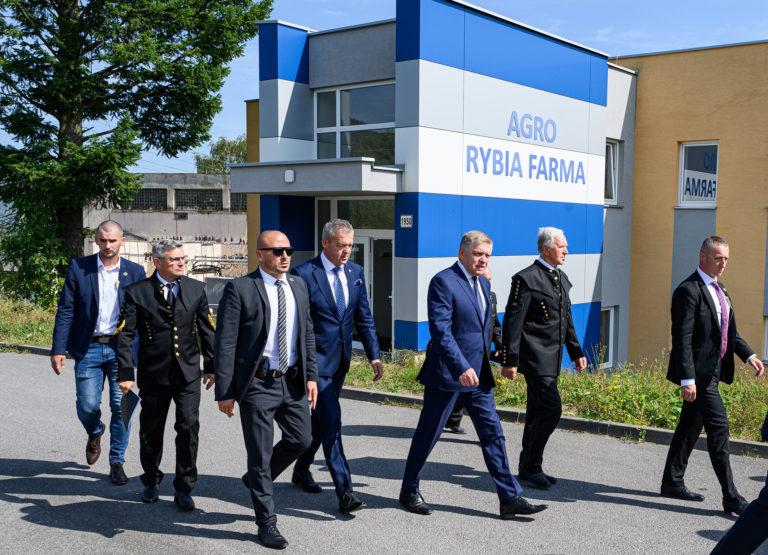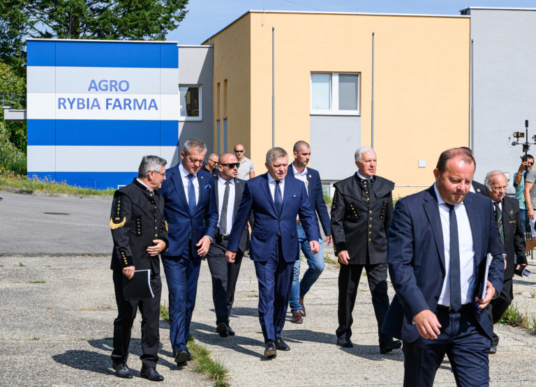 Predseda vlády Robert Fico (v strede) počas návštevy výrobného závodu na chov sladkovodných rýb Agro Rybia farma v Handlovej. Handlová, 6. september 2024. Foto: SITA/Martin Havran.