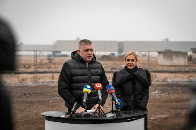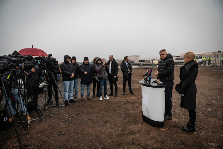 Sprava: Podpredsedníčka vlády a ministerka hospodárstva SR Denisa Saková a predseda vlády SR Robert Fico počas brífingu po stretnutí predsedu vlády SR a ministerky hospodárstva SR s predstaviteľmi Valaliky Industrial Park a MH Invest a obhliadke staveniska v Priemyselnom parku Valaliky v súvislosti so zisteniami Najvyššieho kontrolného úradu (NKÚ) SR. Valaliky, 28. november 2024. Foto: SITA/Úrad vlády SR.