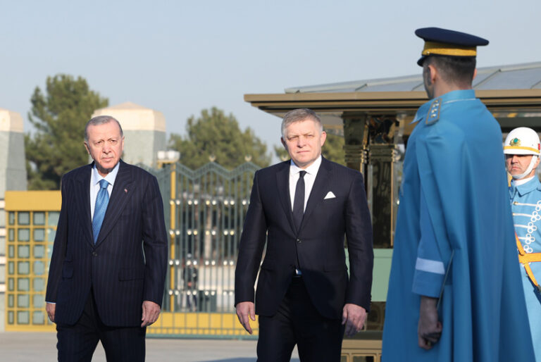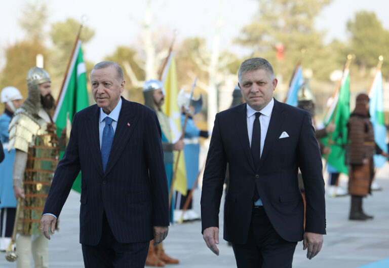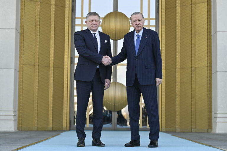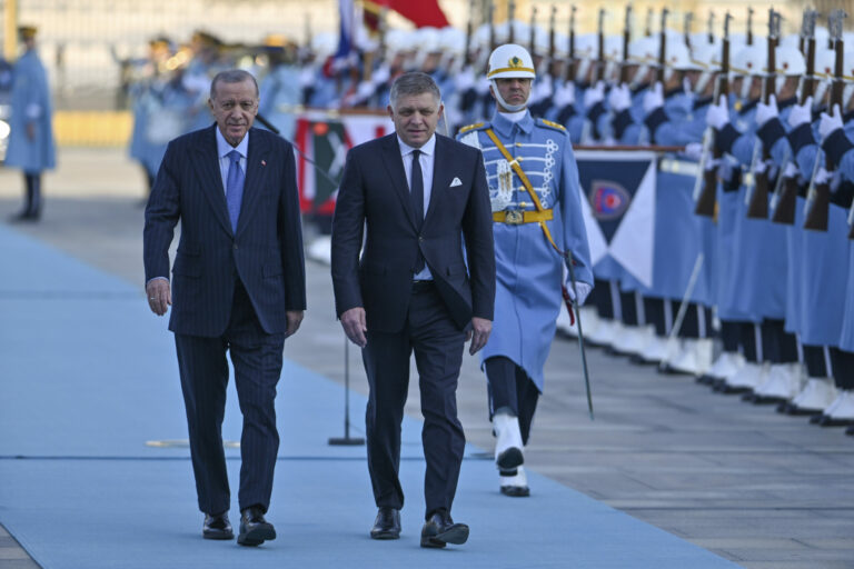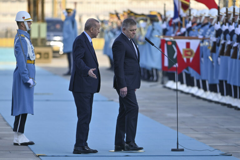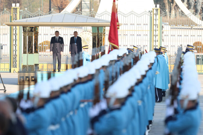 Turecký prezident Recep Tayyip Erdogan (uprostred vľavo) a slovenský premiér Robert Fico (uprostred vpravo) počas uvítacieho ceremoniálu pred ich stretnutím v prezidentskom paláci v Ankare v pondelok 20. januára 2025. Foto: Mert Gokhan Koc/Dia Photo via AP