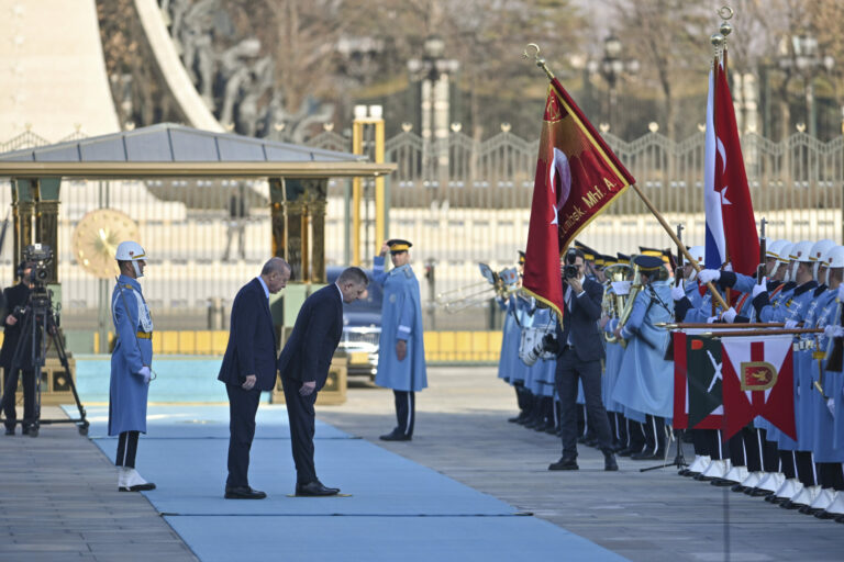 Turecký prezident Recep Tayyip Erdogan (vľavo) a slovenský premiér Robert Fico (vpravo) sa klaňajú počas prehliadky čestnej stráže počas uvítacieho ceremoniálu pred ich stretnutím v prezidentskom paláci v Ankare v pondelok 20. januára 2025. Foto: Mert Gokhan Koc/Dia Photo via AP