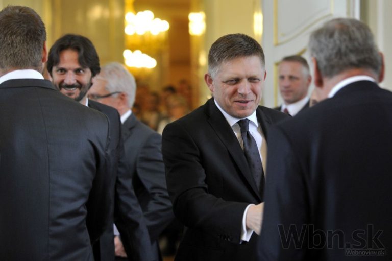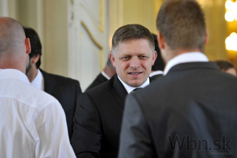 Útočník Tomáš Surový (vľavo chrbtom) a obranca Michal Sersen (vpravo chrbtom) a predseda vlády SR Robert Fico (uprostred) počas prijatia hokejovej reprezentácie na Úrade vlády SR. Foto: SITA/Ján Slovák