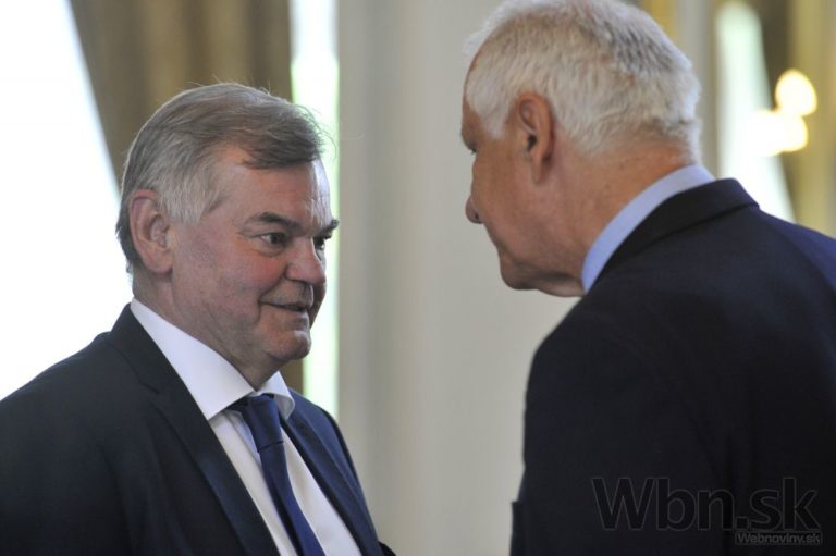 Zľava: Tréner hokejovej reprezentácie Vladimír Vůjtek a splnomocnenec vlády SR pre šport Dušan Galis počas prijatia hokejovej reprezentácie na Úrade vlády SR. Bratislava. Foto: SITA/Ján Slovák