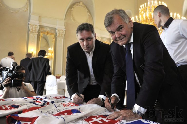 Sprava: Tréner slovenskej hokejovej reprezentácie Vladimír Vůjtek a jeho asistent Peter Oremus podpisujú suveníry počas prijatia hokejovej reprezentácie na Úrade vlády SR. Foto: SITA/Ján Slovák