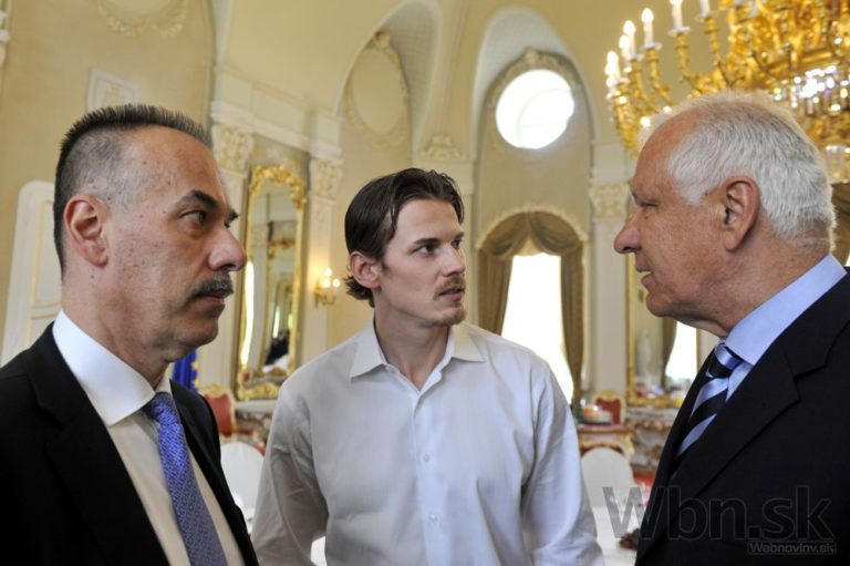 Zľava: Prezident SZĽH Igor Nemeček, kapitán hokejovej reprezentácie Tomáš Kopecký a splnomocnenec vlády SR pre šport Dušan Galis počas prijatia hokejovej reprezentácie na Úrade vlády SR. Foto: SITA/Ján Slovák