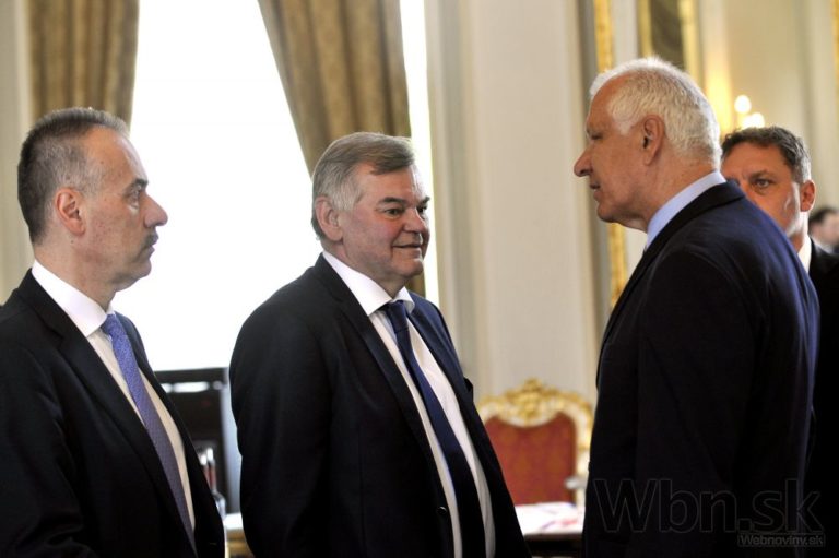 Zľava: Prezident SZĽH Igor Nemeček, tréner slovenskej hokejovej reprezentácie Vladimír Vůjtek a splnomocnenec vlády SR pre šport Dušan Galis počas prijatia hokejovej reprezentácie na Úrade vlády SR. Foto: SITA/Ján Slovák