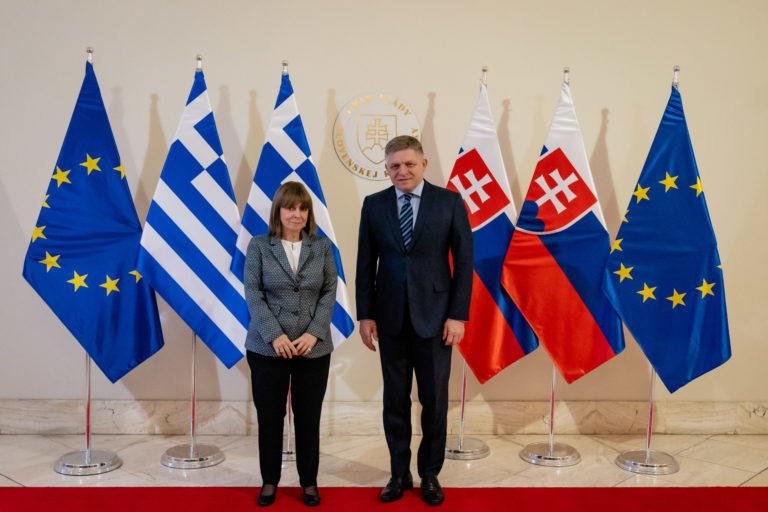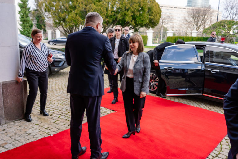 Zľava: Grécka prezidentka Katerina Sakellaropulová a premiér SR Robert Fico počas prijatia na Úrade vlády SR v rámci oficiálnej návštevy prezidentky Grécka na Slovensku. Bratislava, 14. marec 2024. Foto: SITA/Úrad vlády SR.