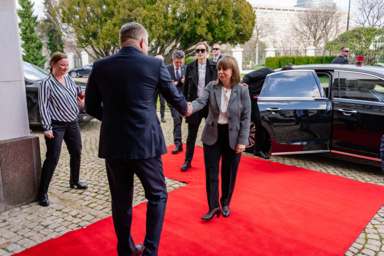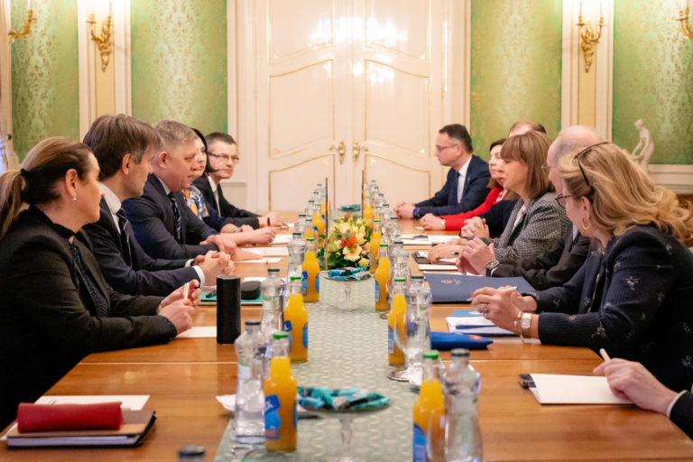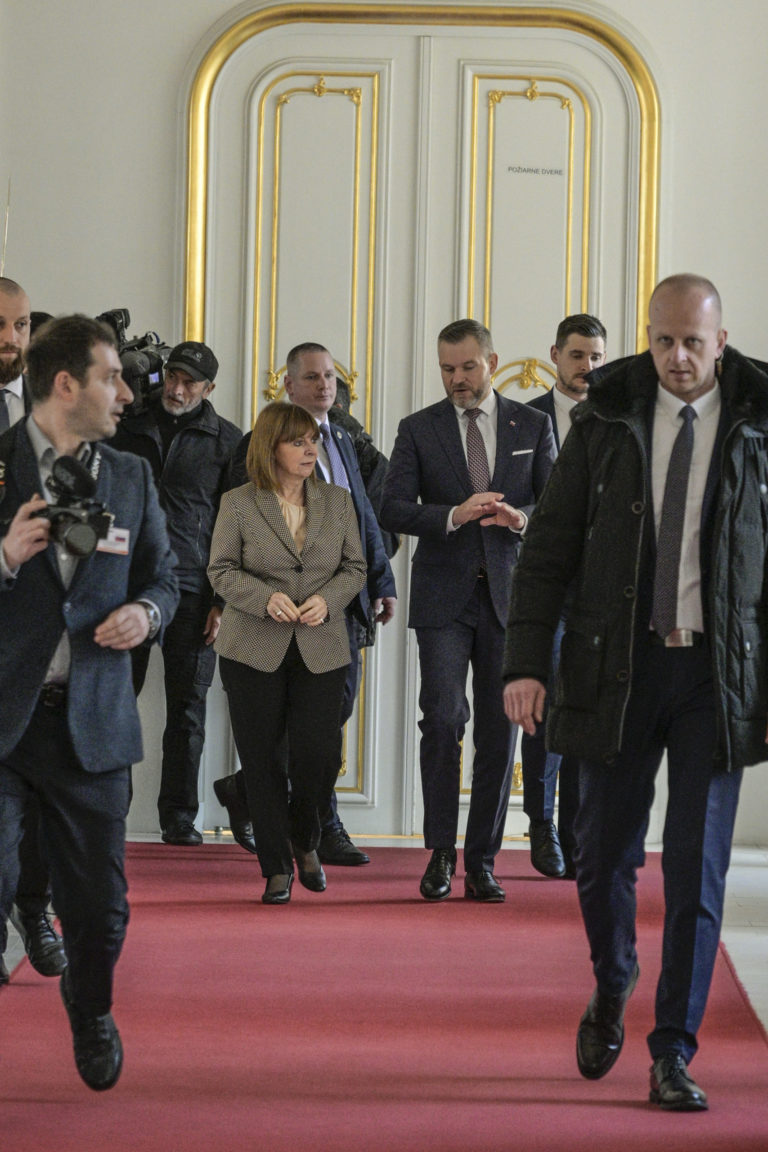 Prezidentka Helénskej republiky Katerina Sakellaropuluová (vľavo) a predseda Národnej rady SR Peter Pellegrini (tretí sprava) počas rokovania v rámci prijatia prezidentky Helénskej republiky Kateriny Sakellaropuluovej v reprezentačných priestoroch Bratislavského hradu. Bratislava, 15. marec 2024. Foto: SITA/Milan Illík.
