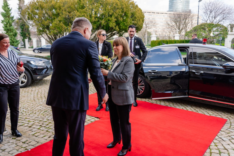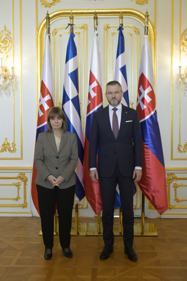 Zľava: Prezidentka Helénskej republiky Katerina Sakellaropuluová a predseda Národnej rady SR Peter Pellegrini počas prijatia prezidentky Helénskej republiky Kateriny Sakellaropuluovej v reprezentačných priestoroch Bratislavského hradu. Bratislava, 15. marec 2024. Foto: SITA/Milan Illík.