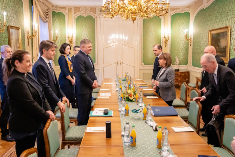 Grécka prezidentka Katerina Sakellaropulová (tretia sprava) a premiér SR Robert Fico (šiesty zľava) počas rokovania na Úrade vlády SR v rámci oficiálnej návštevy prezidentky Grécka na Slovensku. Bratislava, 14. marec 2024. Foto: SITA/Úrad vlády SR.