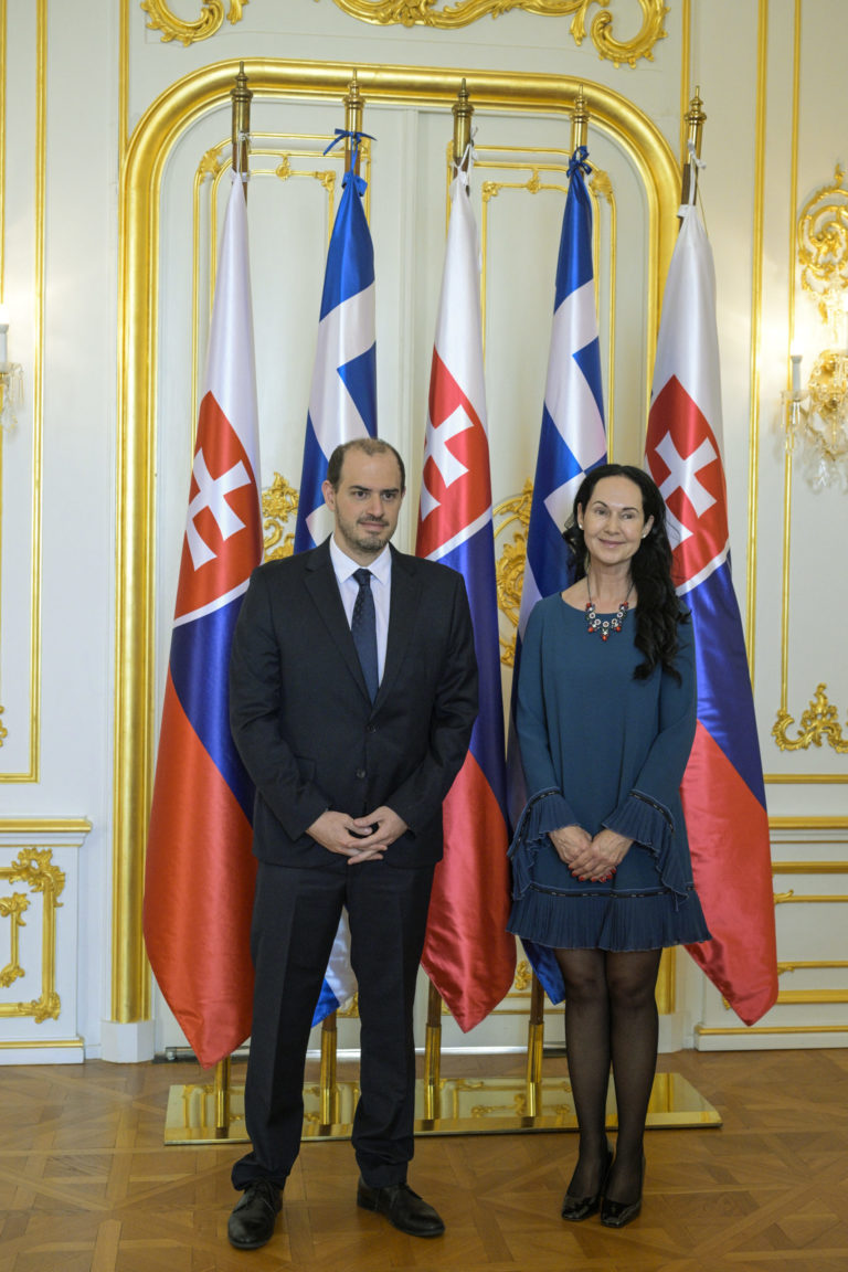 Zľava: Zástupca ministra zahraničných vecí Helénskej republiky Georgios Kotsiras a štátna tajomníčka Ministerstva vnútra SR Lucia Kurilovská počas podpisu Memoranda o porozumení medzi Ministerstvom vnútra SR a Ministerstvom pre klimatickú a civilnú ochranu Helénskej republiky pri príležitosti prijatia Helénskej prezidentky predsedom Národnej rady SR v reprezentačných priestoroch Bratislavského hradu. Bratislava, 15. marec 2024. Foto: SITA/Milan Illík.