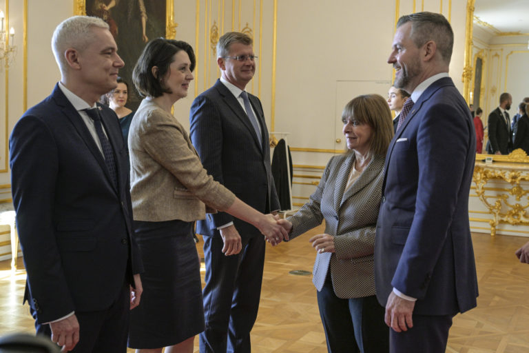 Zľava uprostred: Prezidentka Helénskej republiky Katerina Sakellaropuluová a predseda Národnej rady SR Peter Pellegrini počas prijatia prezidentky Helénskej republiky Kateriny Sakellaropuluovej v reprezentačných priestoroch Bratislavského hradu. Bratislava, 15. marec 2024. Foto: SITA/Milan Illík.