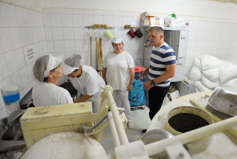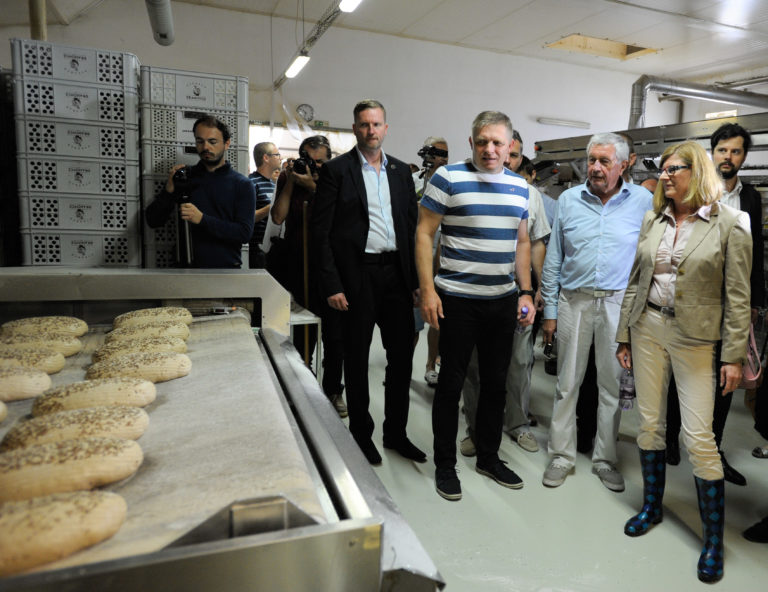 Predseda vlády Robert Fico (vpravo) počas prehliadky pekárne v rámci Poľnohospodárskeho družstva Drahovce pri príležitosti brífingu na tému: Žatva na Slovensku v roku 2017. Drahovce, 11. júl 2017. Foto: SITA/Martin Medňanský
