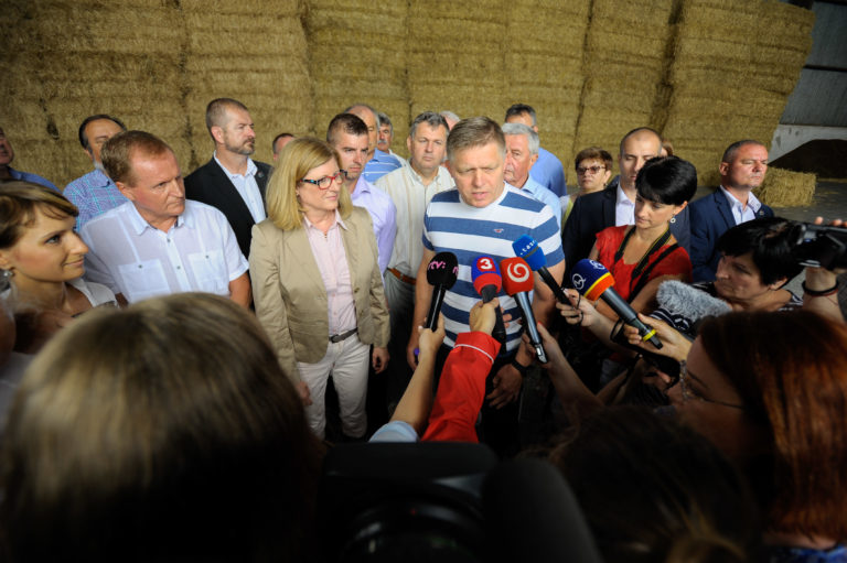 Predseda vlády Robert Fico a ministerka pôdohospodárstva a rozvoja vidieka Gabriela Matečná počas brífingu na tému: Žatva na Slovensku v roku 2017. Drahovce, 11. júl 2017. Foto: SITA/Martin Medňanský