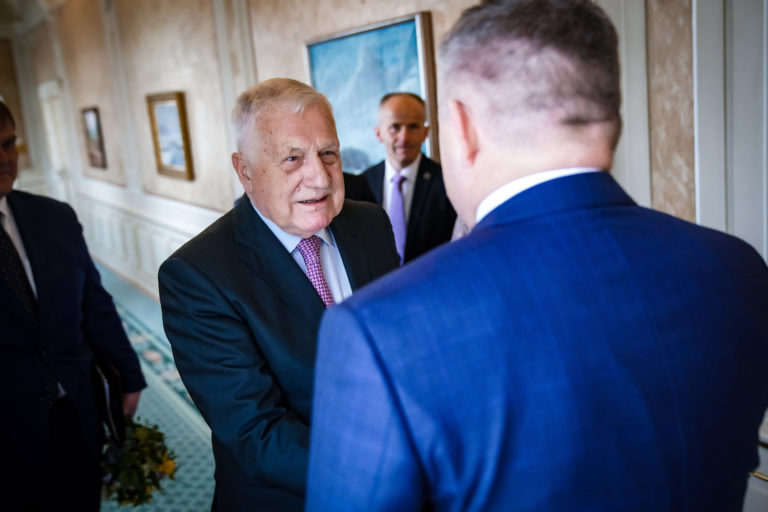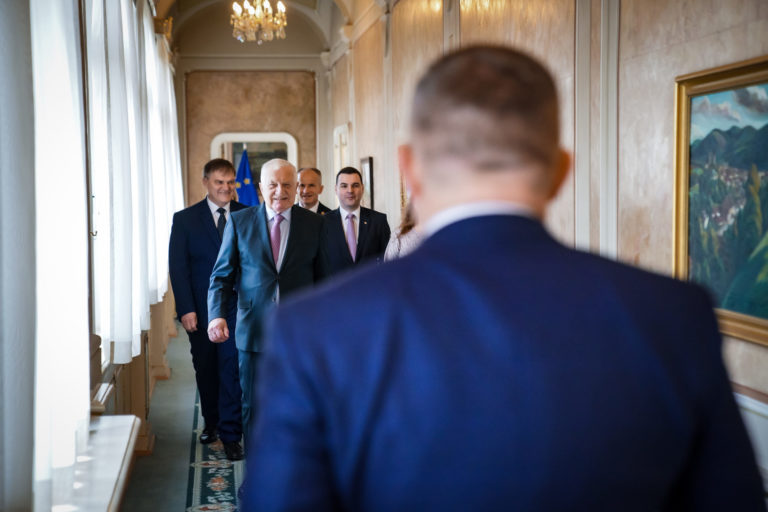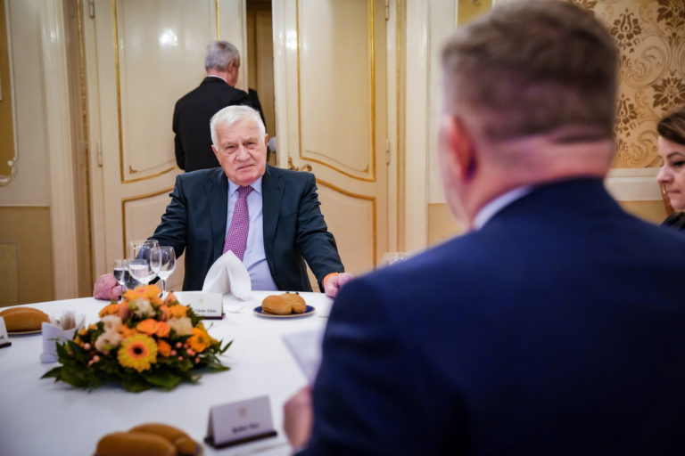 Zľava v popredí: Bývalý prezident Českej republiky Václav Klaus a predseda vlády Slovenskej republiky Robert Fico počas stretnutia na Úrade vlády SR. Bratislava, 11. marec 2024. Foto: SITA/Úrad vlády SR.
