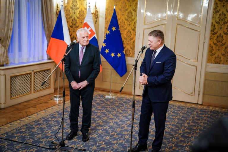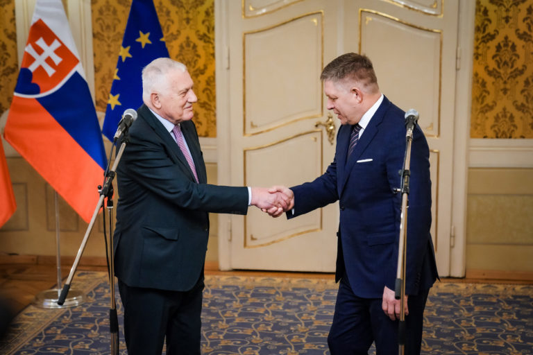 Zľava: Bývalý prezident Českej republiky Václav Klaus a predseda vlády Slovenskej republiky Robert Fico počas spoločného vyhlásenia v rámci stretnutia na Úrade vlády SR. Bratislava, 11. marec 2024. Foto: SITA/Úrad vlády SR.