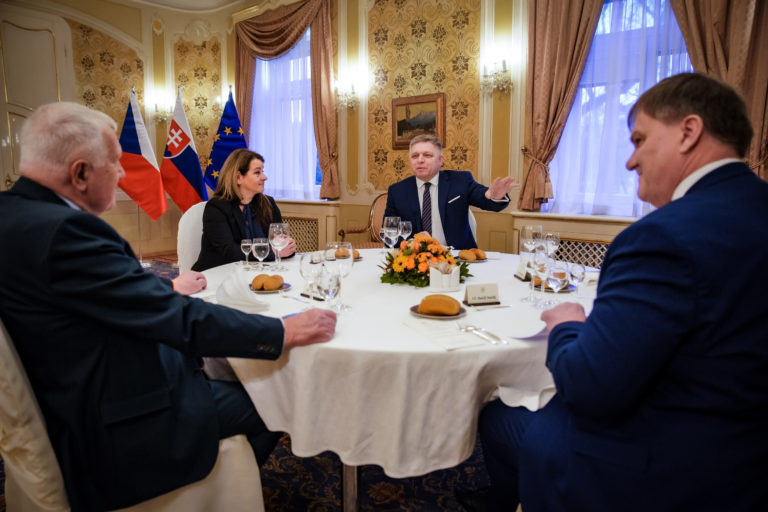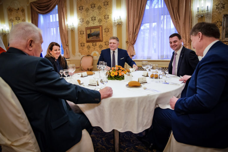 Bývalý prezident Českej republiky Václav Klaus (vľavo) a predseda vlády Slovenskej republiky Robert Fico (druhý sprava) počas rokovania v rámci stretnutia na Úrade vlády SR. Bratislava, 11. marec 2024. Foto: SITA/Úrad vlády SR.