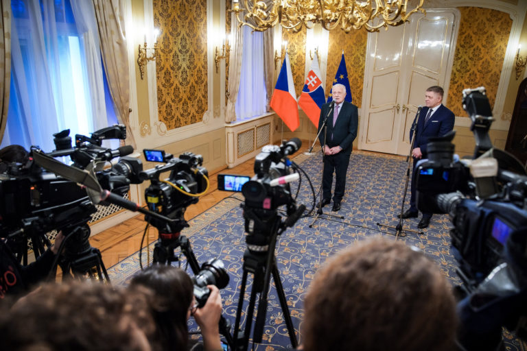 Zľava: Bývalý prezident Českej republiky Václav Klaus a predseda vlády Slovenskej republiky Robert Fico počas spoločného vyhlásenia po stretnutí na Úrade vlády SR. Bratislava, 11. marec 2024. Foto: SITA/Úrad vlády SR.