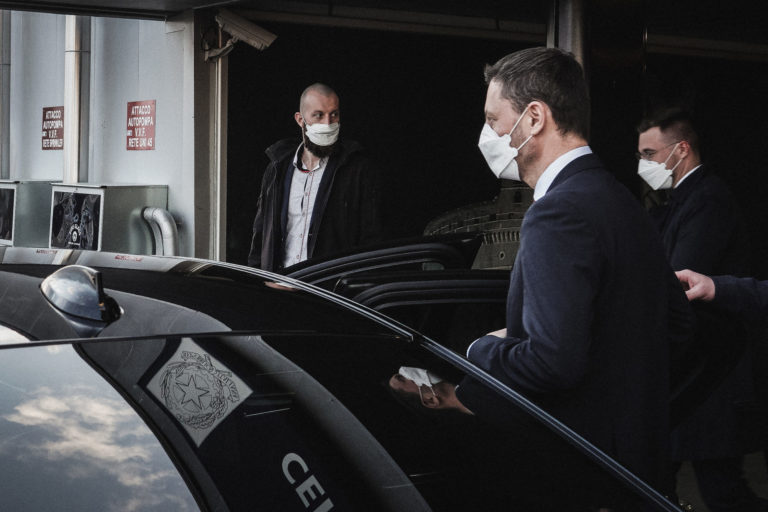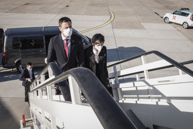 Predseda vlády SR Eduard Heger (uprostred) nastupuje do vládneho špeciálu pred prvou oficiálnou návštevou Vatikánu, v rámci ktorej ho prijal pápež František. Bratislava, 14. marec 2022. Foto: SITA/Úrad vlády SR