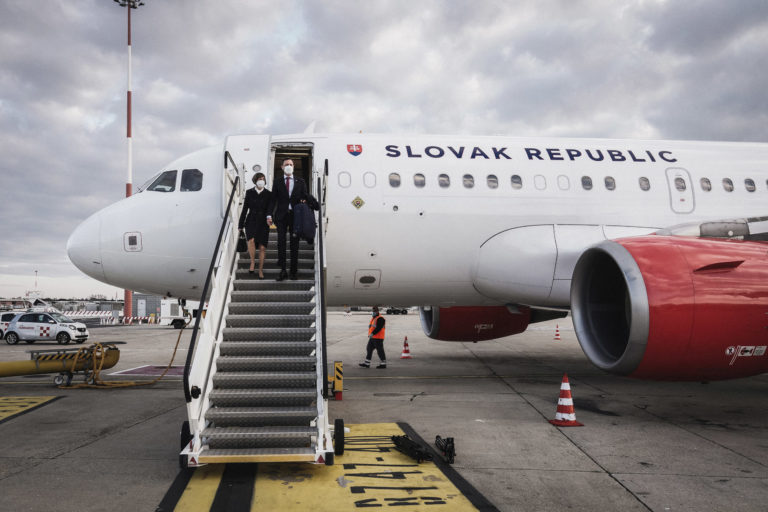 Predseda vlády SR Eduard Heger (vpravo) vystupuje z vládneho špeciálu počas prvej oficiálnej návštevy Vatikánu, v rámci ktorej ho prijal pápež František. Bratislava, 14. marec 2022. Foto: SITA/Úrad vlády SR