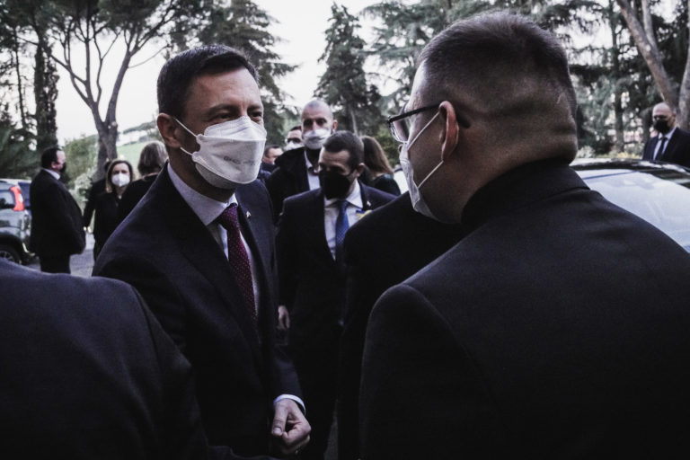 Zľava: Predseda vlády SR Eduard Heger a štátny tajomník Ministerstva zahraničných vecí a európskych záležitostí SR Martin Klus počas prvej oficiálnej návštevy vo Vatikáne. Bratislava, 14. marec 2022. Foto: SITA/Vatican Media