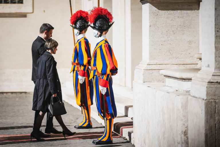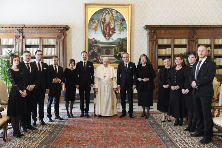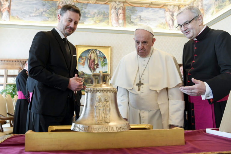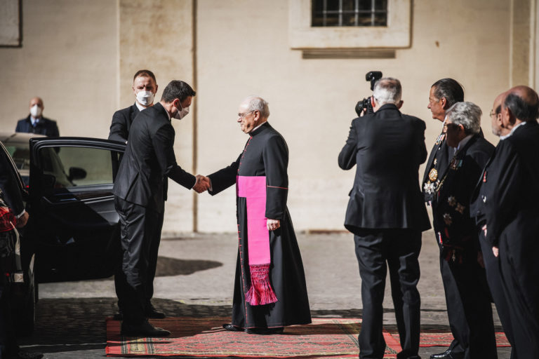 Predseda vlády SR Eduard Heger (uprostred) počas prvej oficiálnej návštevy Vatikánu, v rámci ktorej ho prijal pápež František. Bratislava, 14. marec 2022. Foto: SITA/Úrad vlády SR