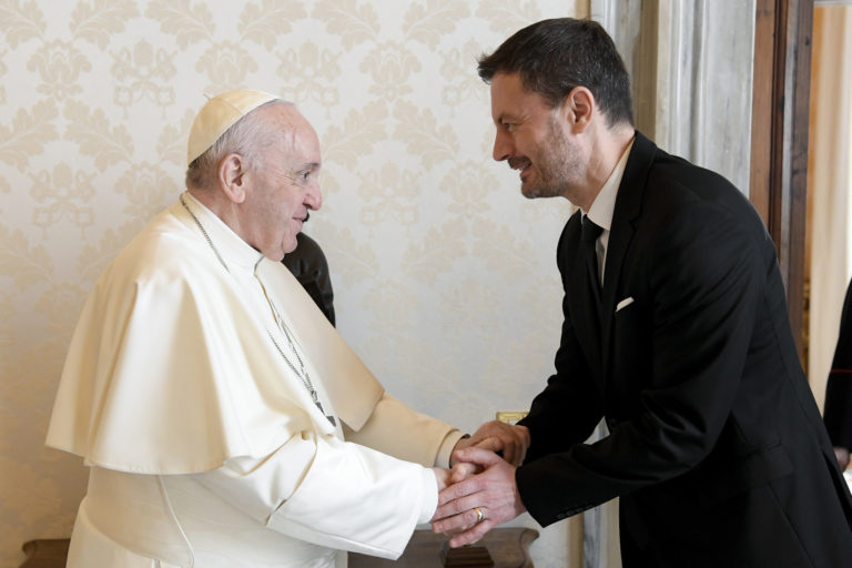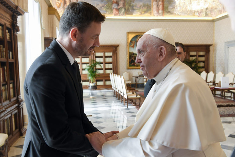 Predseda vlády SR Eduard Heger (vľavo) počas prvej oficiálnej návštevy Vatikánu, v rámci ktorej ho prijal pápež František. Bratislava, 14. marec 2022. Foto: SITA/Úrad vlády SR