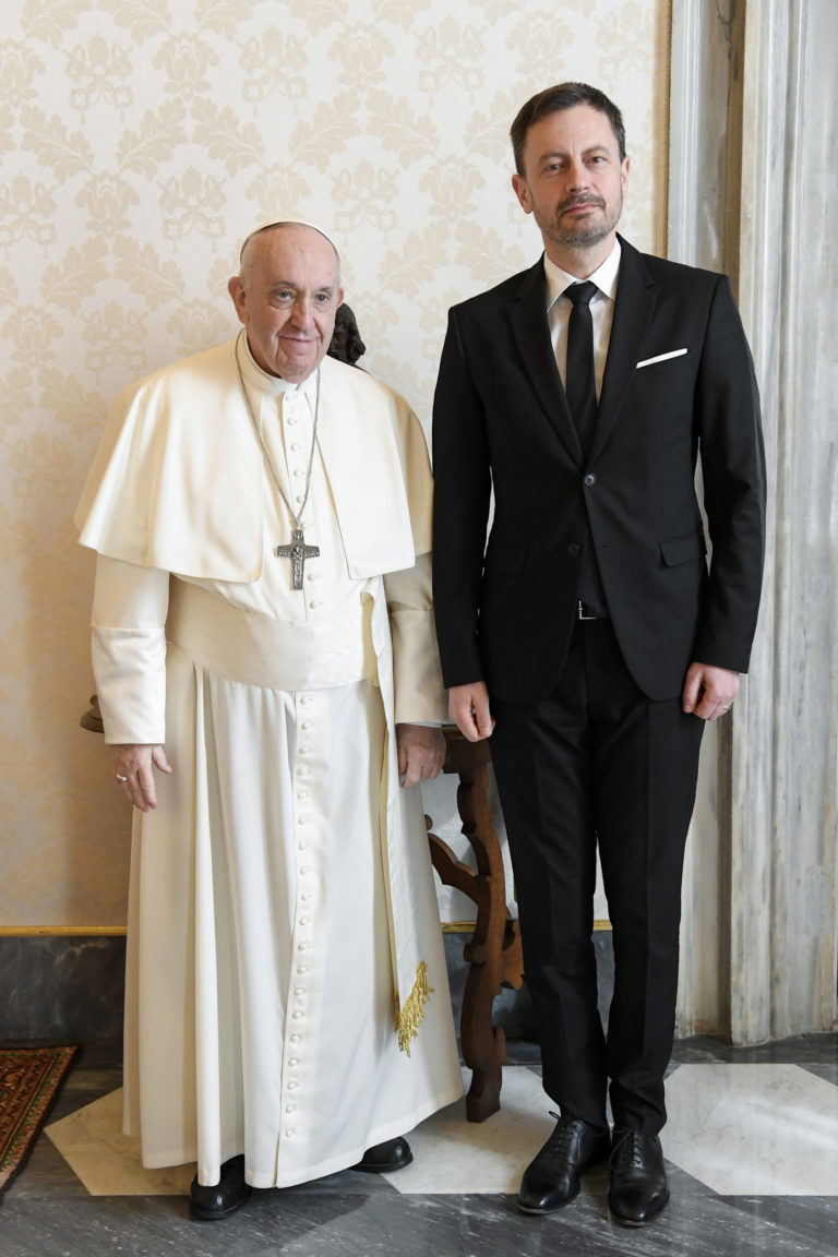 Sprava: Pápež František a predseda vlády SR Eduard Heger počas prijatia premiéra SR Svätým Otcom v rámci jeho prvej oficiálnej návštevy premiéra vo Vatikáne. Bratislava, 14. marec 2022. Foto: SITA/Vatican Media
