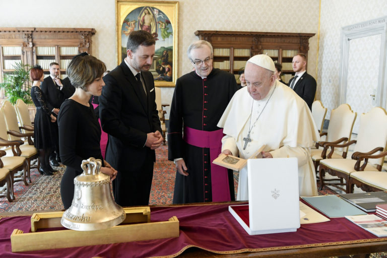 Zľava: Pápež František a predseda vlády SR Eduard Heger počas prijatia premiéra SR Svätým Otcom v rámci prvej oficiálnej návštevy premiéra vo Vatikáne. Bratislava, 14. marec 2022. Foto: SITA/Vatican Media