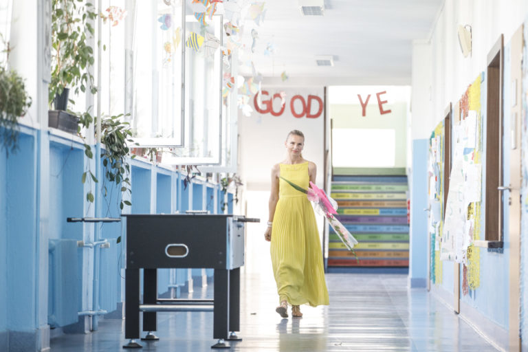 Učiteľka s kvetmi na Základnej škole Pavla Marcelyho v Bratislave počas odovzdávania koncoročných vysvedčení žiakom 5. ročníka za účasti premiéra SR. Bratislava, 30. jún 2022. Foto: SITA/Branislav Bibel
