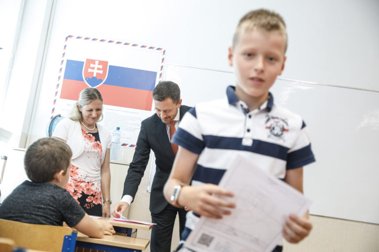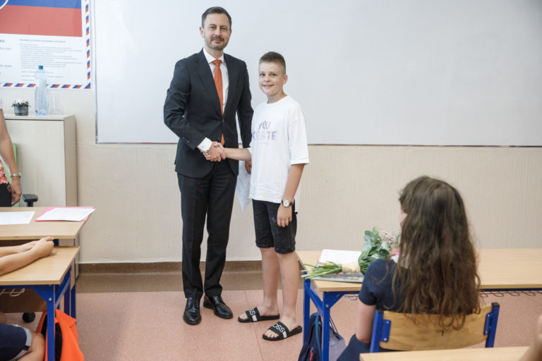 Predseda vlády SR Eduard Heger (vpravo) pred odovzdávaním koncoročných vysvedčení žiakom 5. ročníka Základnej školy Pavla Marcelyho v Bratislave. Bratislava, 30. jún 2022. Foto: SITA/Branislav Bibel