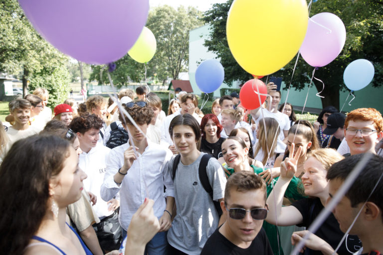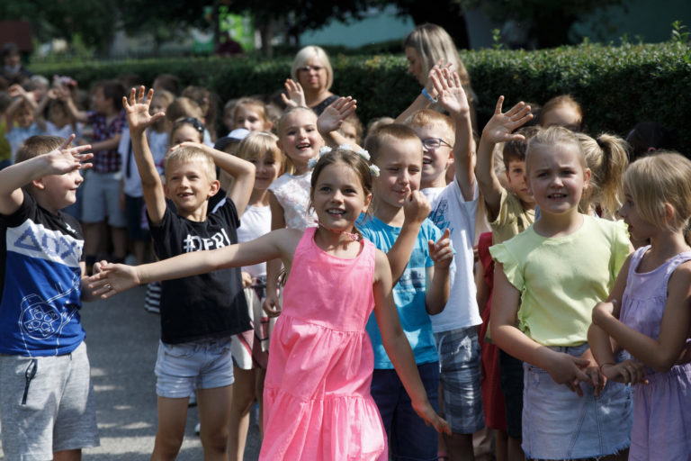 Žiaci Základnej školy Pavla Marcelyho v Bratislave sa fotia počas návštevy premiérom SR pri príležitosti odovzdávania koncoročných vysvedčení. Bratislava, 30. jún 2022. Foto: SITA/Branislav Bibel