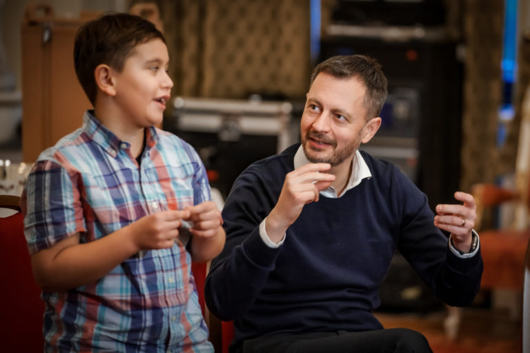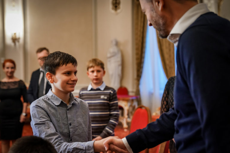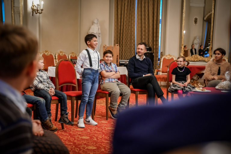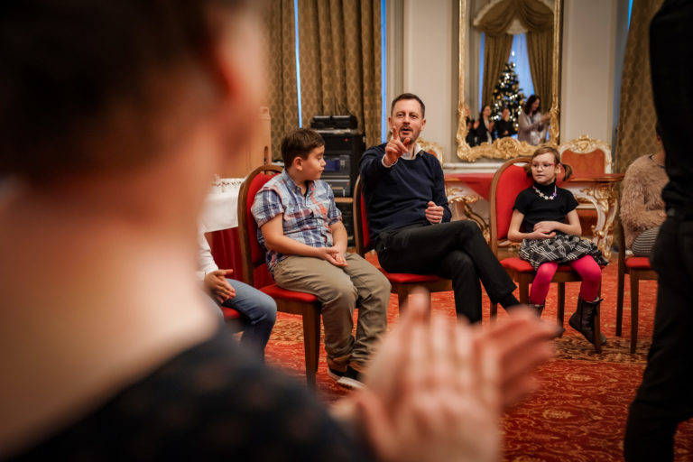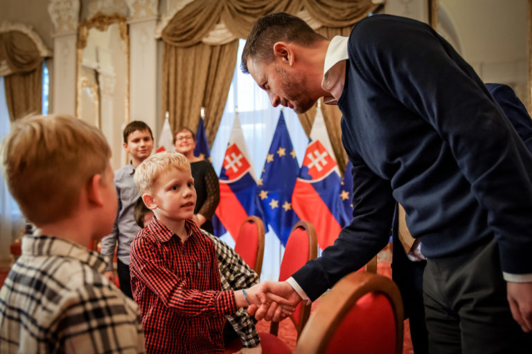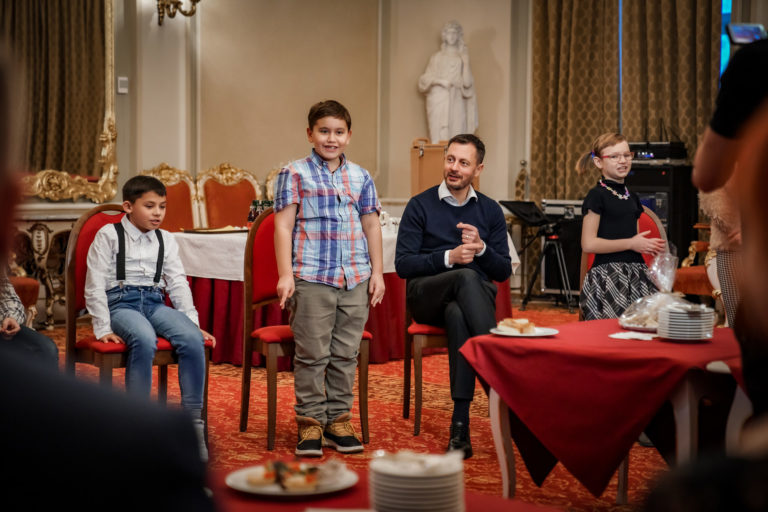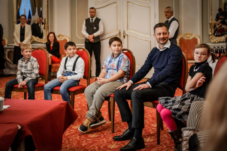 Dočasne poverený premiér Eduard Heger počas prijatia detí z detského domova v Piešťanoch a ich vychovávateľov na Úrade vlády SR. Bratislava, 24. december 2022. Foto: SITA/Úrad vlády SR.