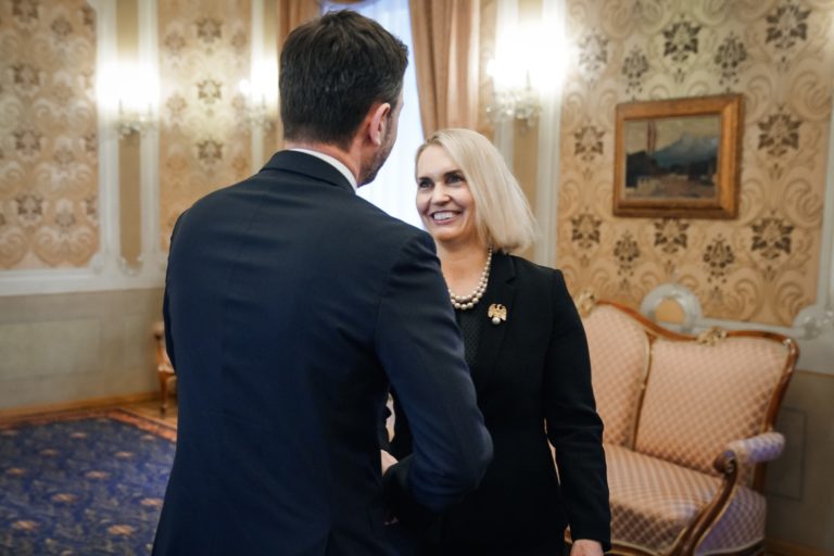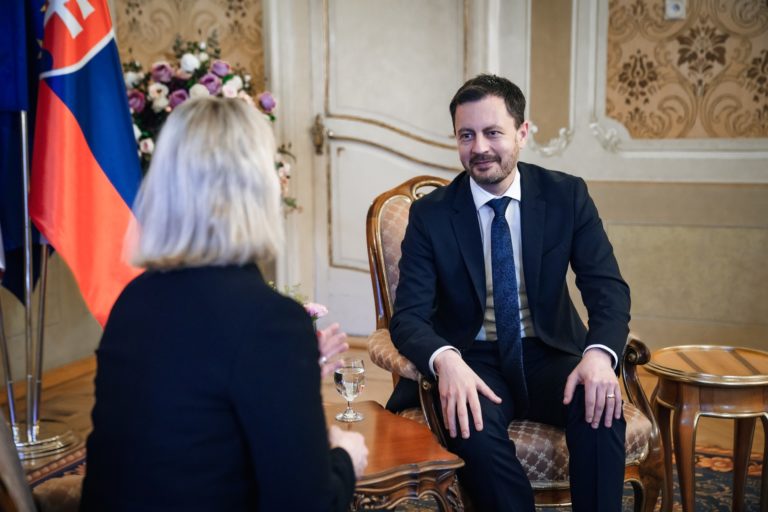 Sprava: Premiér SR Eduard Heger a veľvyslankyňa USA Bridget Brinková. Foto: SITA/Úrad vlády SR