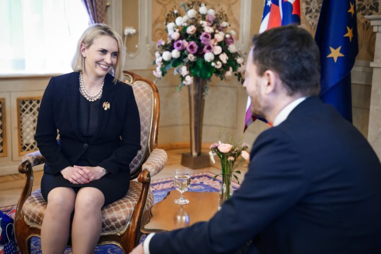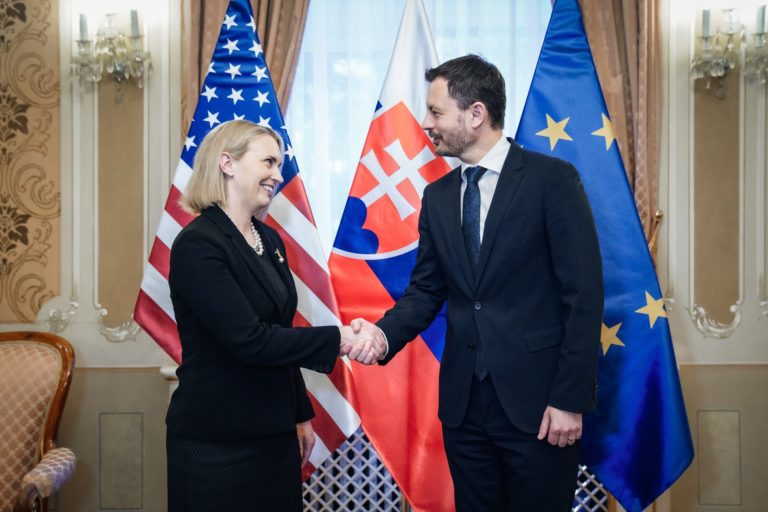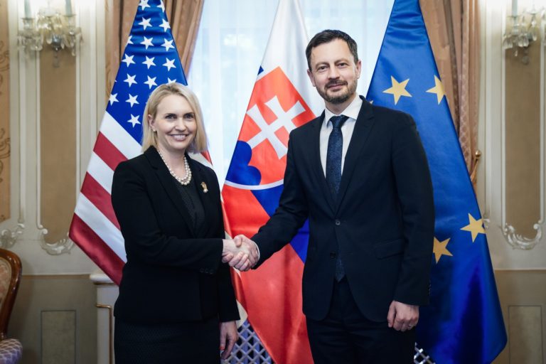 Zľava: Premiér SR Eduard Heger a veľvyslankyňa USA Bridget Brinková. Foto: SITA/Úrad vlády SR