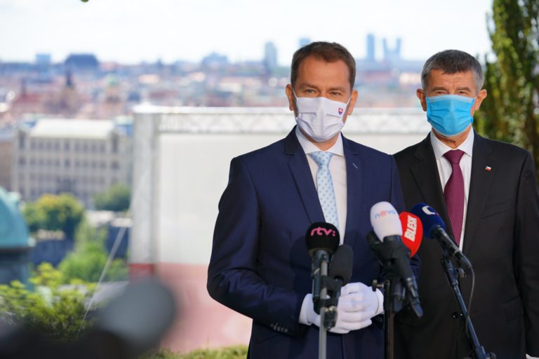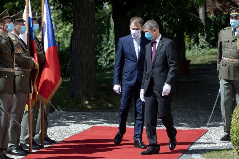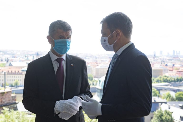 Zľava: Premiér SR Igor Matovič a premiér ČR Andrej Babiš počas stretnutia v Prahe v rámci prvej oficiálnej návštevy predsedu vlády SR v Českej republike. Praha, 3. jún 2020. Foto: SITA/Branislav Bibel