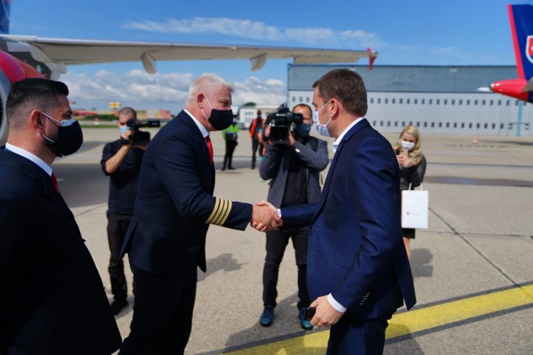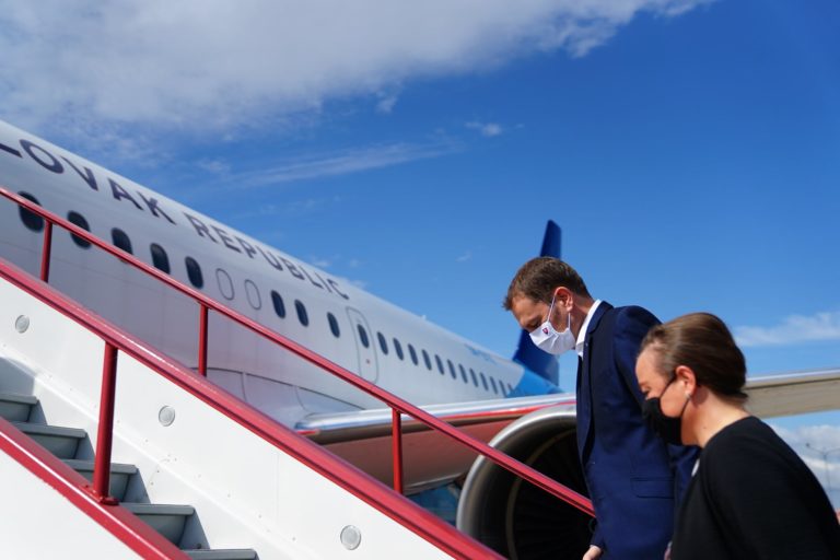 Premiér Igor Matovič nastupuje do lietadla a odcháda na prvú zahraničnú oficiálnu návštevu Českej republiky. 3. jún 2020 Foto: www.facebook.com