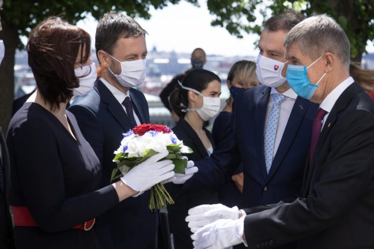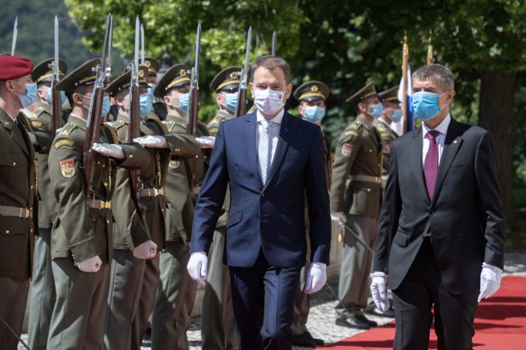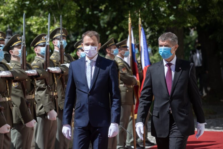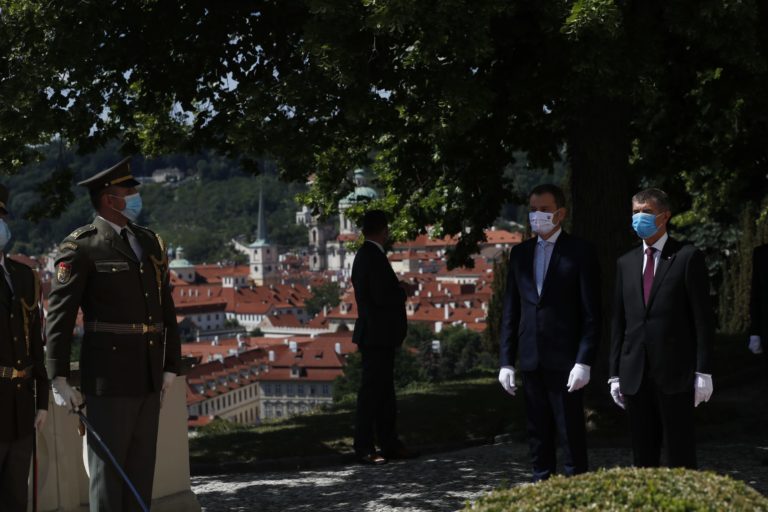 Zľava uprostred: Premiér SR Igor Matovič a premiér ČR Andrej Babiš počas slávnostného ceremoniálu v Prahe v rámci prvej oficiálnej návštevy predsedu vlády SR v Českej republike. Praha, 3. jún 2020. Foto: SITA/Branislav Bibel