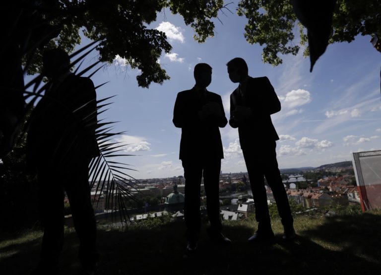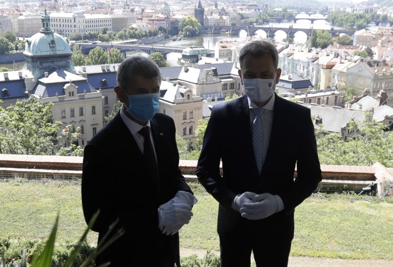 Zľava: Premiér ČR Andrej Babiš a premiér SR Igor Matovič pred začiatkom ich rokovania v Prahe v rámci prvej oficiálnej návštevy predsedu vlády SR v Českej republike. Praha, 3. jún 2020. Foto: SITA/AP