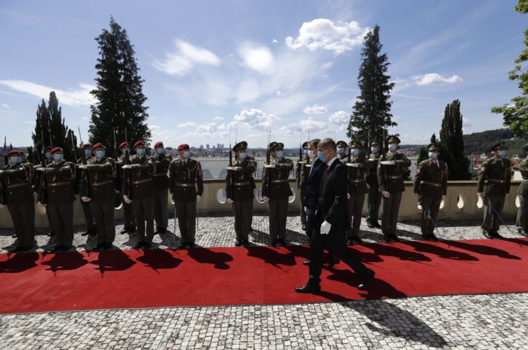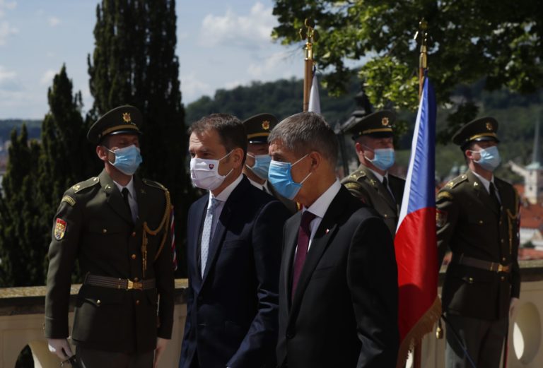 Premiér SR Igor Matovič a premiér ČR Andrej Babiš počas slávnostného ceremoniálu v Prahe v rámci prvej oficiálnej návštevy predsedu vlády SR v Českej republike. Praha, 3. jún 2020. Foto: SITA/AP