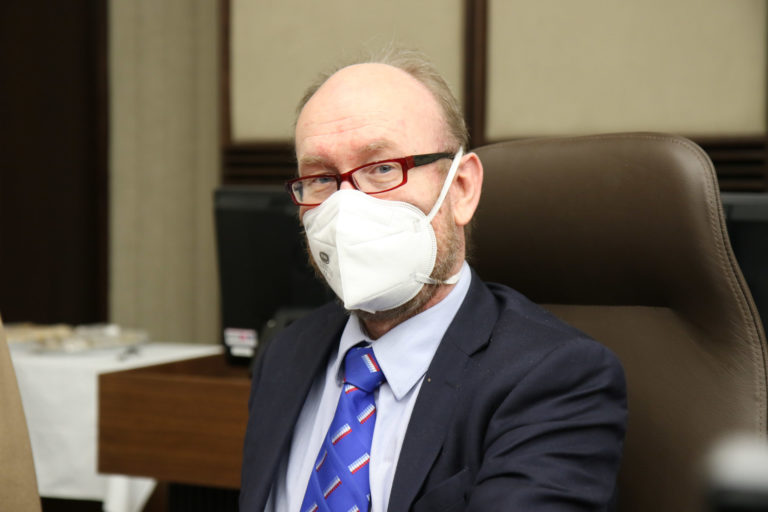 Infektológ Pavol Jarčuška počas rokovania predsedu vlády SR s vedcami a odborníkmi na COVID-19 v súvislosti s ďalšími krokmi a opatreniami, ktoré pomôžu zlepšiť epidemiologickú situáciu na Slovensku. Bratislava, 23. február 2021. Foto: SITA/Alexandra Čunderlíková
