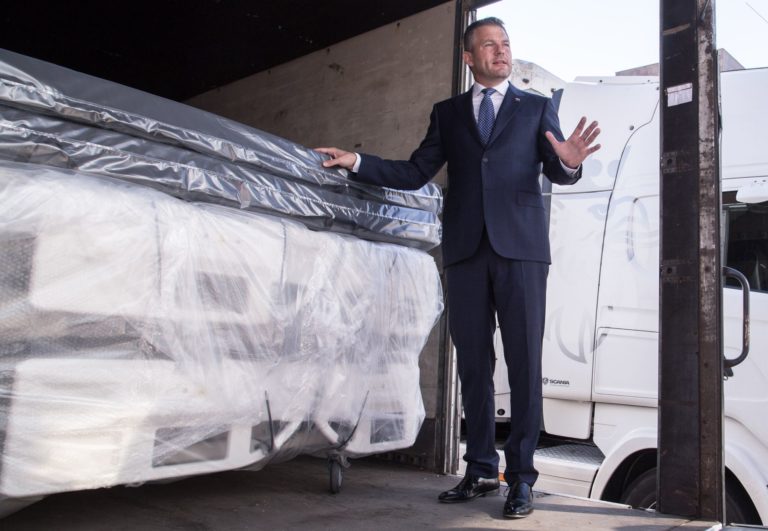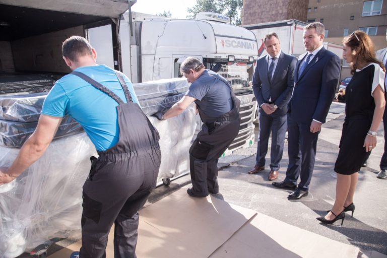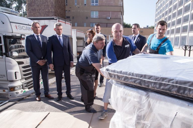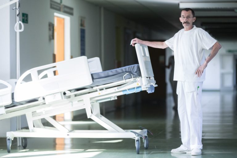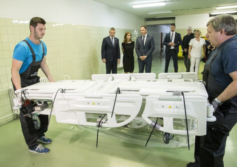 Zamestnanec nemocnice s novým lôžkom počas návštevy premiéra SR Univerzitnej nemocnice sv. Cyrila a Metoda v Petržalke, kde sa premiér SR informoval o aktuálnom stave obnovy lôžok pre pacientov. Bratislava, 10. september 2018. Foto: SITA/Braňo Bibel