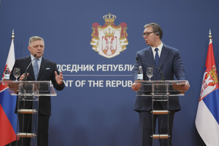 Slovenský premiér Robert Fico počas tlačovej konferencie so srbským prezidentom Aleksandarom Vučičom v Srbskom paláci. Belehrad, 21. november 2024. Foto: SITA/AP