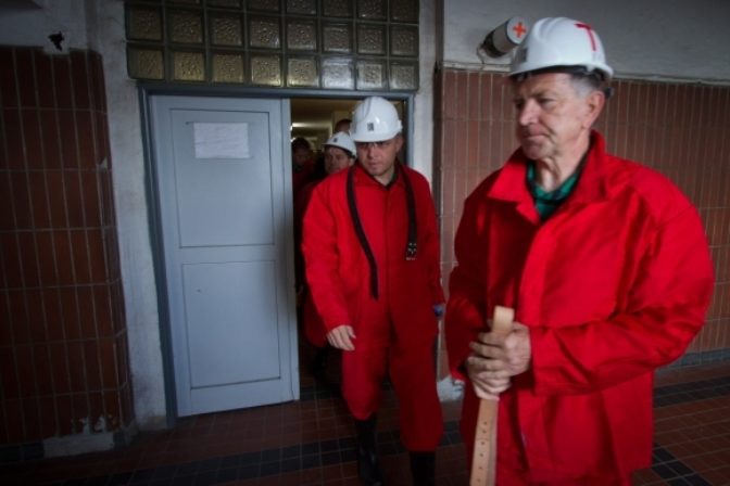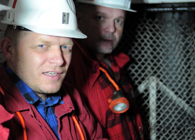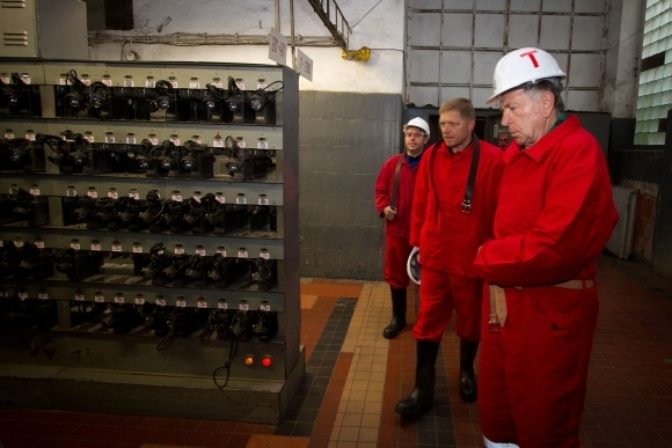 Premiér SR Robert Fico (vľavo) sfáral do podzemia Hornonitrianskych baní Prievidza v ťažobnom úseku Bane Nováky pri príležitosti regionálnych osláv Dňa baníkov. Nováky, 5. september 2014. Foto: SITA/Martin Havran