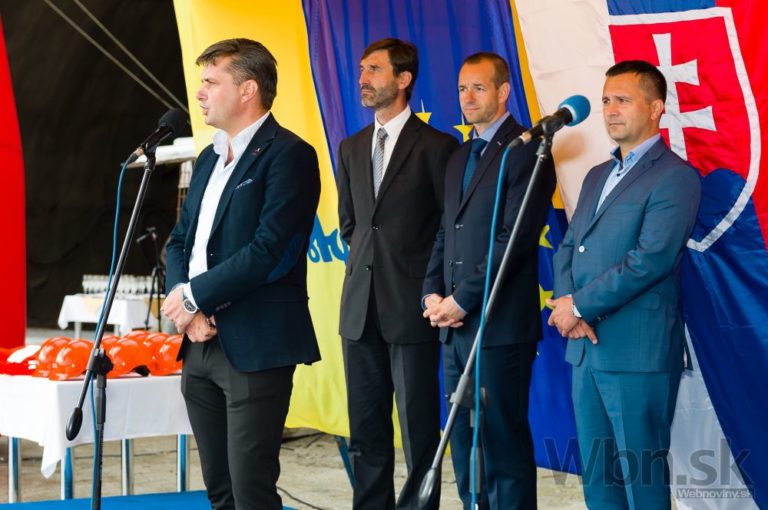 Zľava: Predseda predstavenstva spoločnosti Doprastav Juraj Androvič, predseda ŽSK Juraj Blanár, štátny tajomník Ministerstva dopravy, výstavby a regionálneho rozvoja SR Viktor Stromček a generálny riaditeľ Národnej diaľničnej spoločnosti (NDS) Milan Gajdoš počas príhovoru predsedu predstavenstva spoločnosti Doprastav pri príležitosti slávnostného prerazenia tunela Poľana na úseku diaľnica D3 Svrčinovec - Skalité. Foto: SITA/Milo Fabian