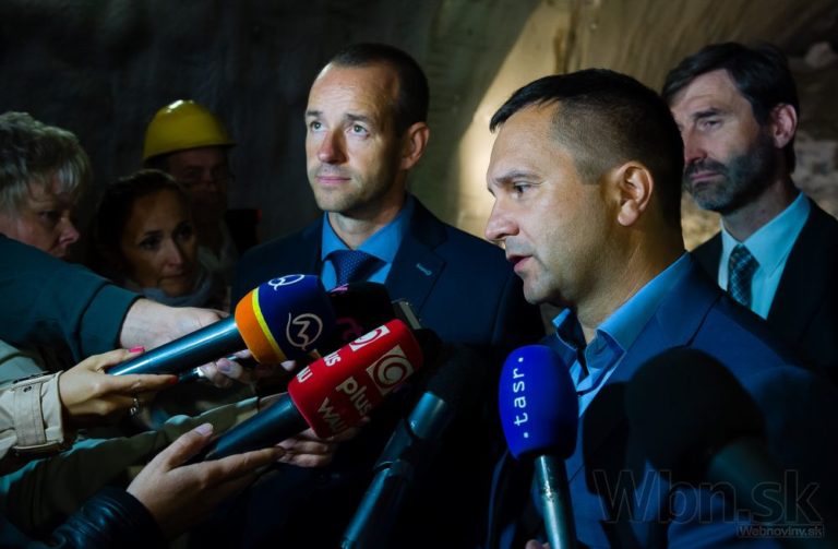 Zľava v popredí: Štátny tajomník Ministerstva dopravy, výstavby a regionálneho rozvoja SR Viktor Stromček a generálny riaditeľ Národnej diaľničnej spoločnosti (NDS) Milan Gajdoš počas brífingu po slávnostnom prerazení tunela Poľana na úseku diaľnica D3 Svrčinovec - Skalité. Foto: SITA/Milo Fabian